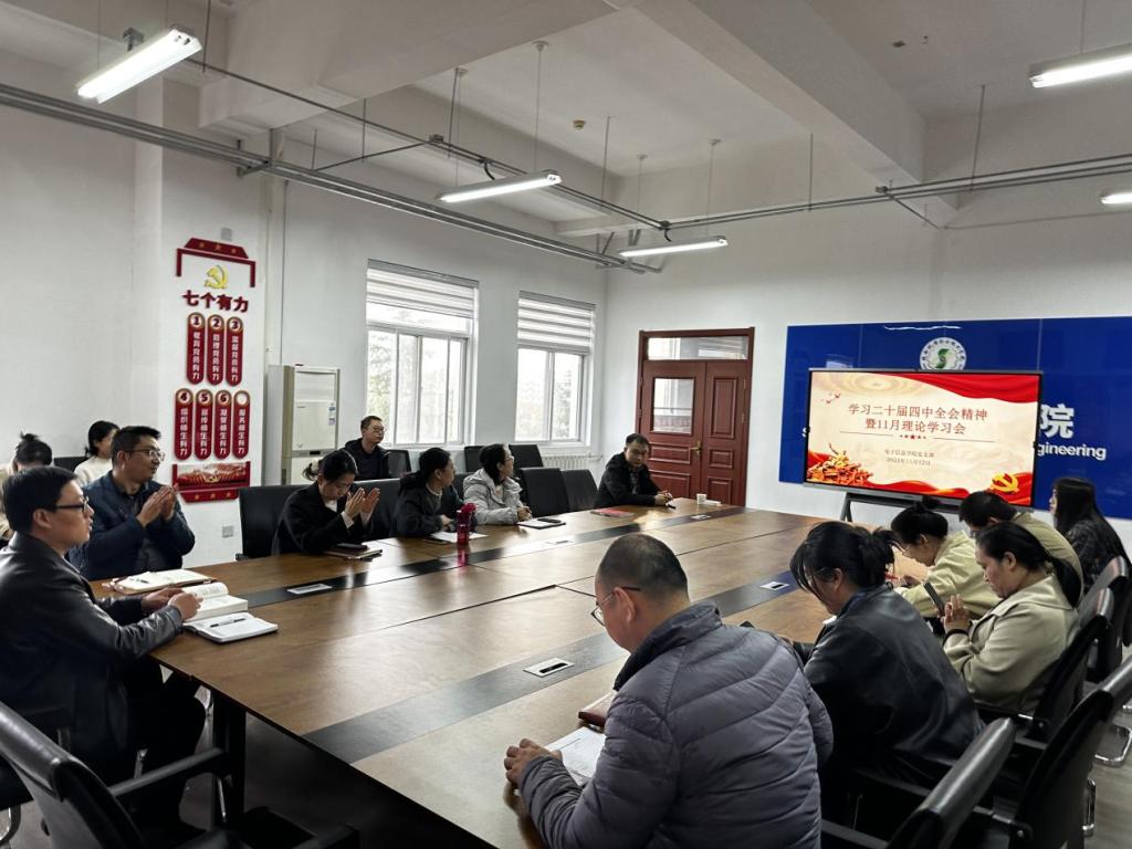 为深入学习贯彻党的二十届四中全会精神,推动理论学习与职业教育实践深度融合,11月12日下午,电子信息学院党支部在强技楼东203会议室召开专题辅导讲座暨11月理论学习会。会议由党支部副书记高赋主持,全体党员参会,马克思主义学院负责人王康老师受邀作专题党课辅导。