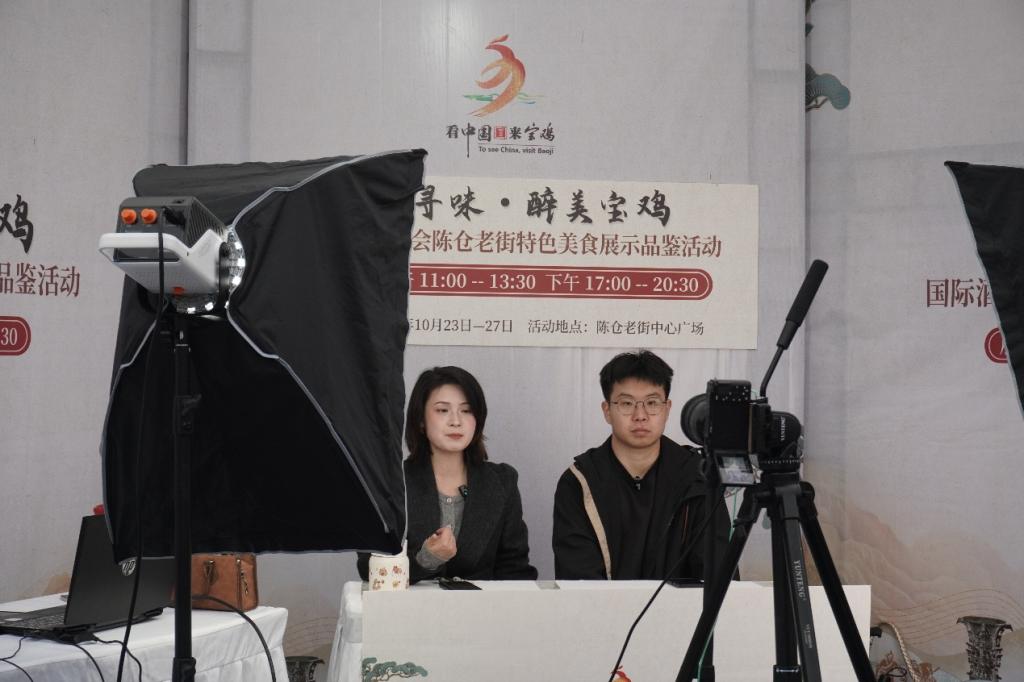 在陈仓老街·太阳市展区,11名直播专业的学生穿梭于各大展位之间,精心设计直播脚本,认真调试设备,熟练地进行现场直播报道。