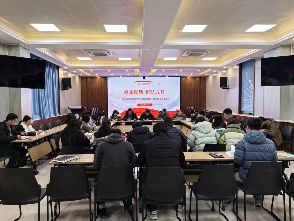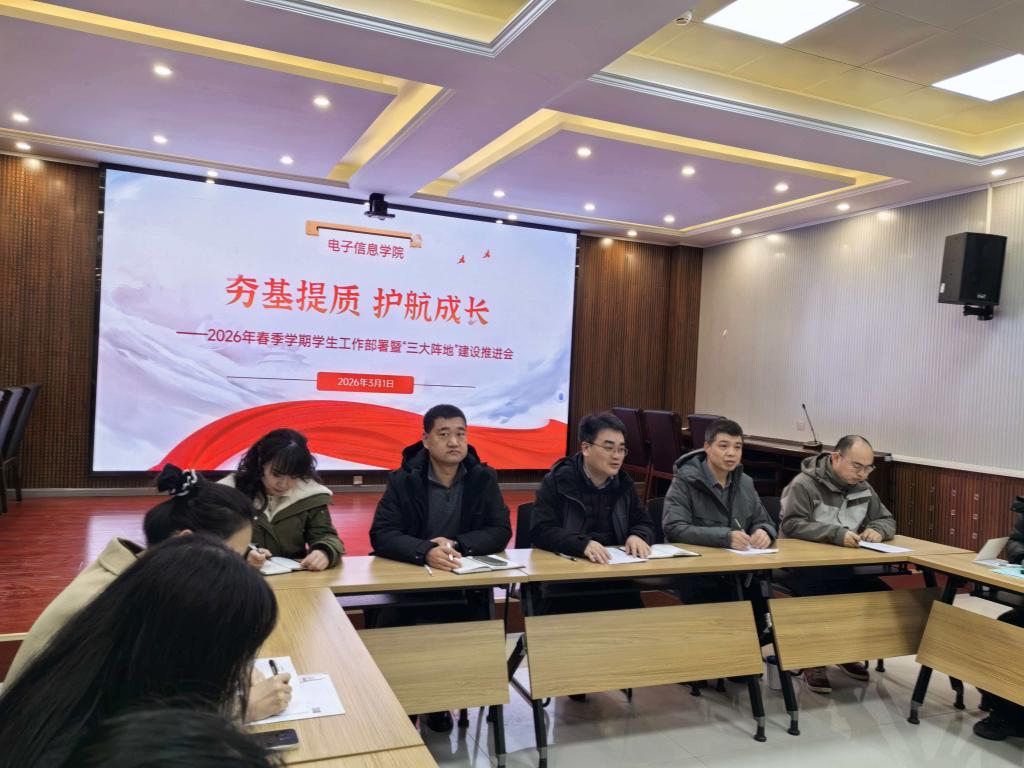 3月1日下午,电子信息学院2026年春季第一次学工例会在博学楼111视频会议室顺利召开。学院党支部书记杨鹏,副书记副院长王建国、冯秋佳,学工办主任汪思池,综合办主任车红丽及全体专职辅导员、班主任参加会议,会议由汪思池主持。