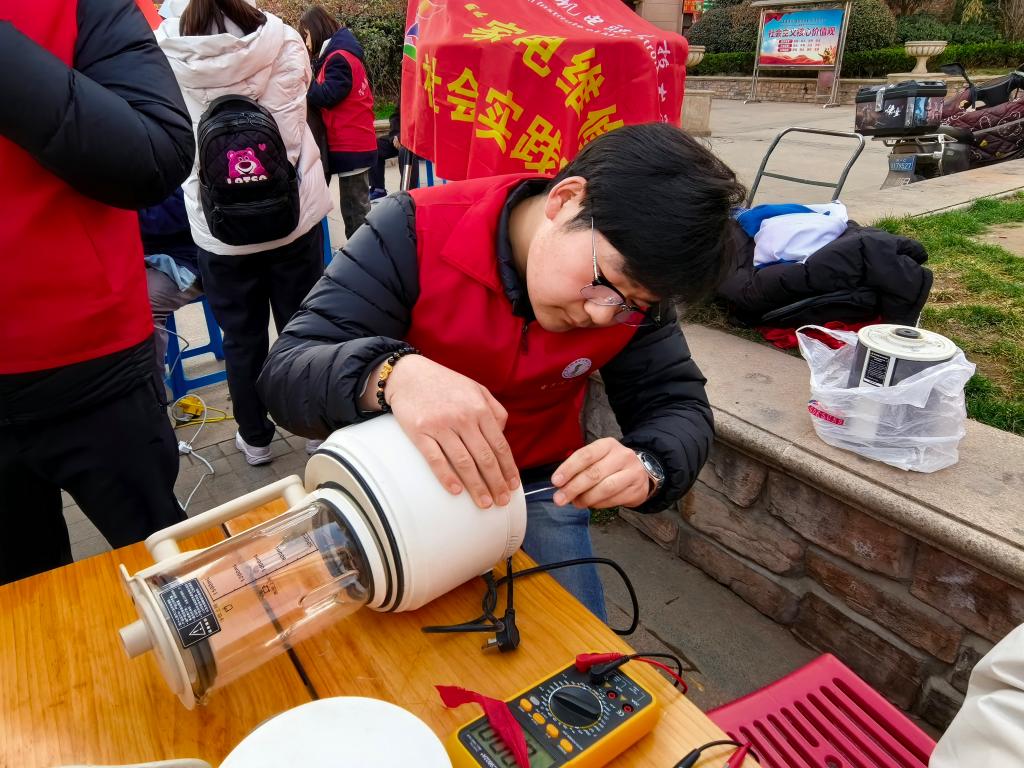 我院党支部书记杨鹏,校团委副书记郭世强,学工办主任、团总支书记汪思池,专任教师景鹏斌及6名学生志愿者共同参与,充分发挥专业优势,为社区居民提供小家电义务维修服务。活动现场,志愿者们耐心接待前来咨询和送修的居民,认真检测,维修电饭煲、电磁炉、电插板、热水壶等常用小家电,赢得居民一致好评。